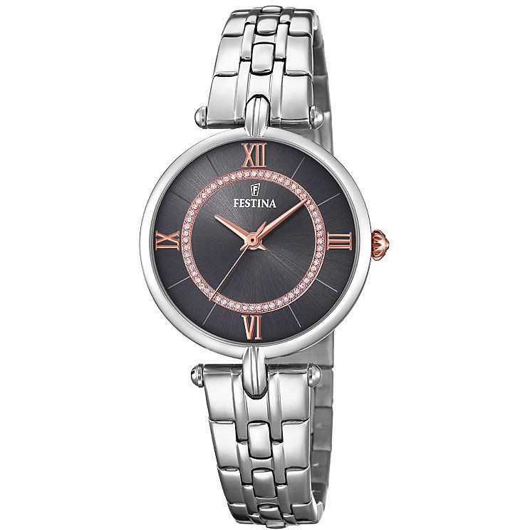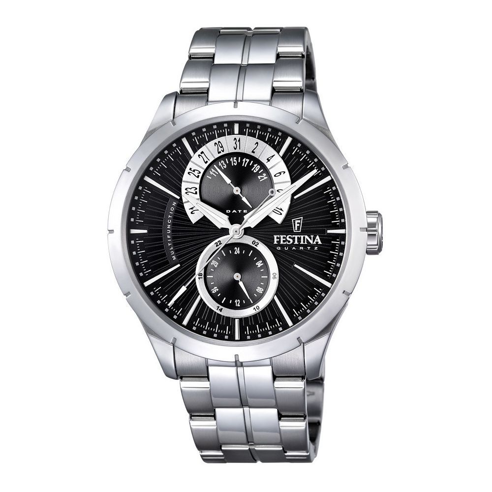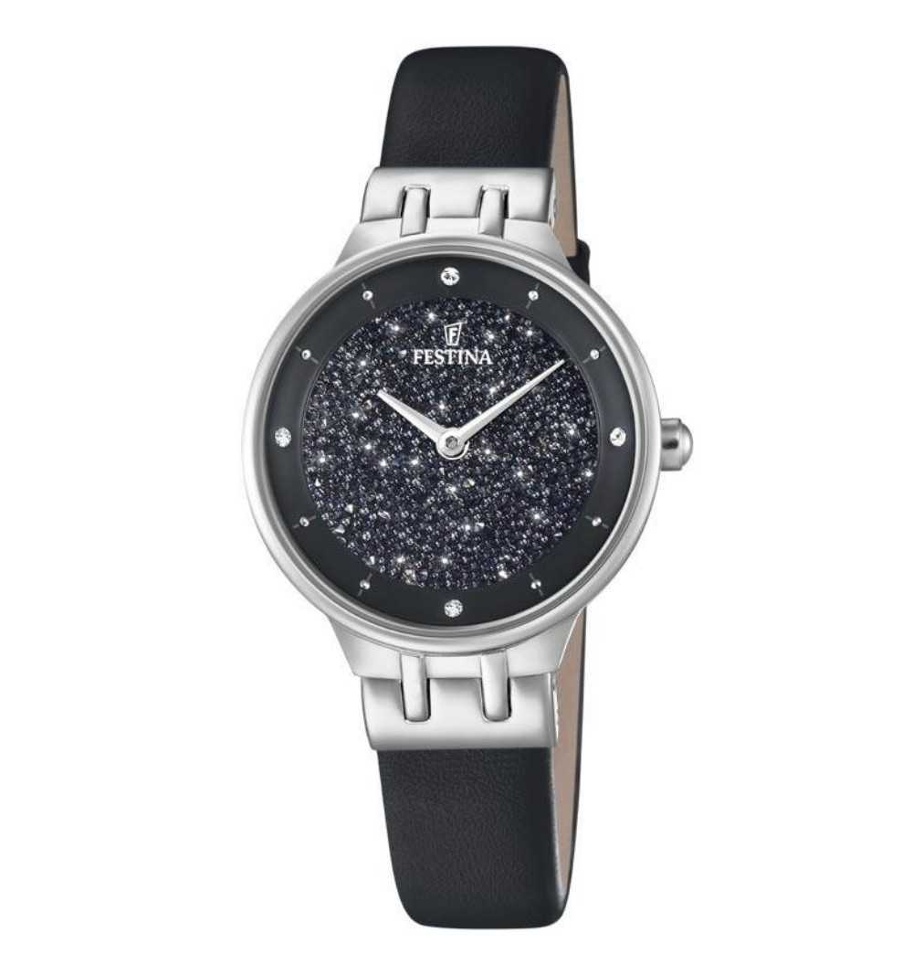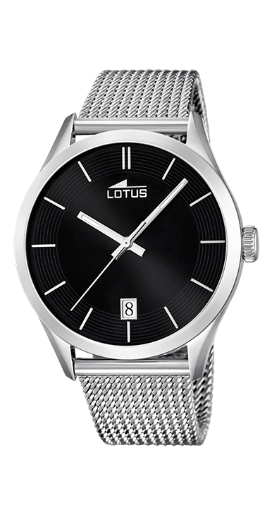 Orologio in acciaio con quadrante nero.