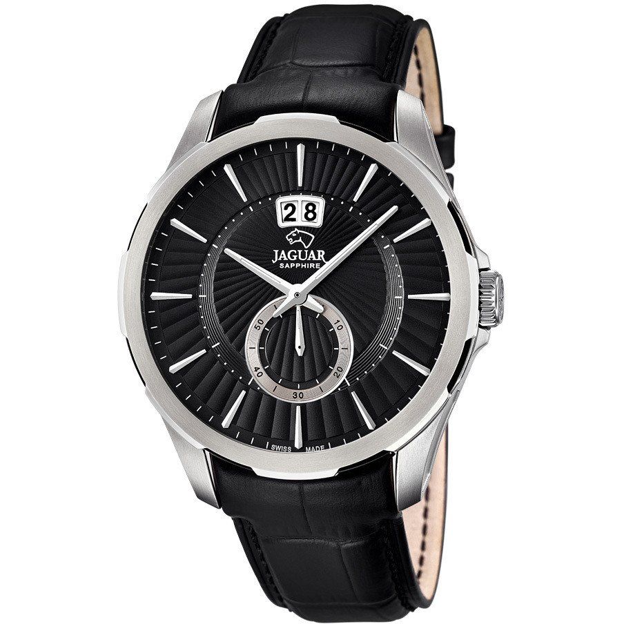 Orologio in acciaio con quadrante nero e cinturino in pelle nero.
