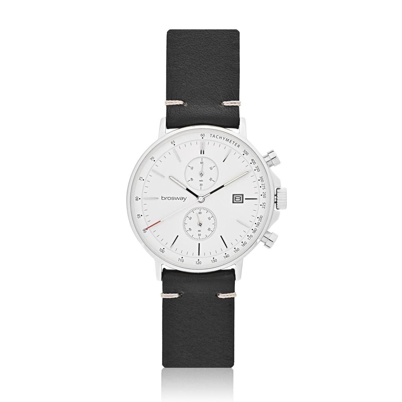Orologio crono in acciaio 304 con quadrante bianco e cinturino in pelle nera.